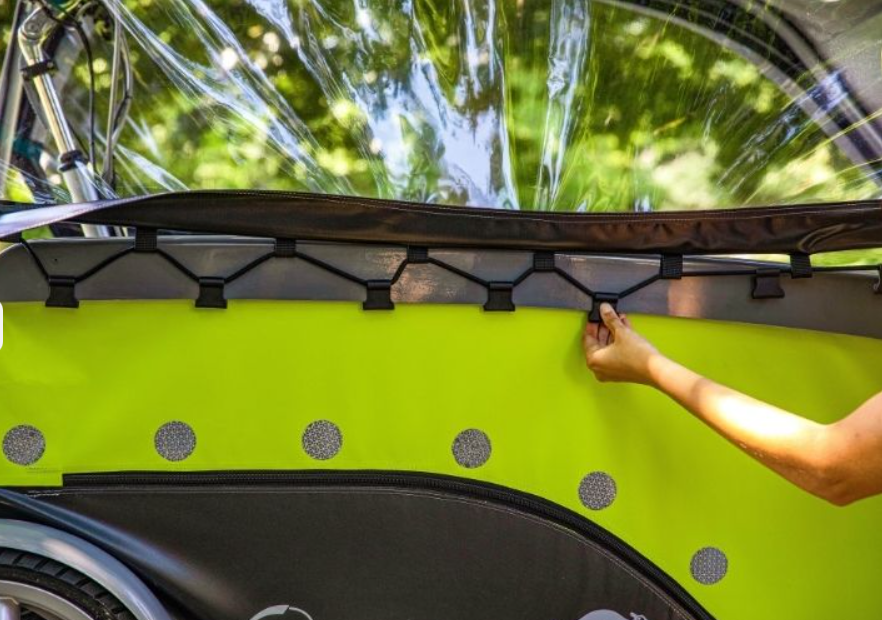 Optioneel is de GoCab uit te breiden met een overkappingszeil, zodat de kinderen altijd droog zitten.