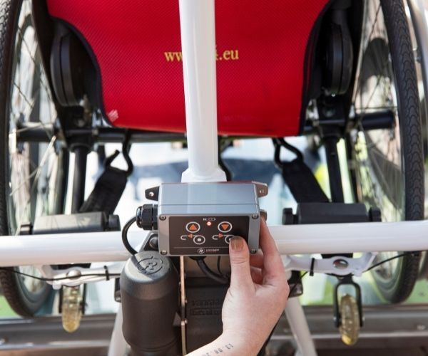of veel krachtinspanning wordt de bijrijder op het plateau van de fiets gereden. De kantelbare oprijplaat maakt het mogelijk de handbewogen rolstoel eenvoudig op de rolstoelfiets te rijden en met de rolstoelvergrendeling goed vast te zetten.